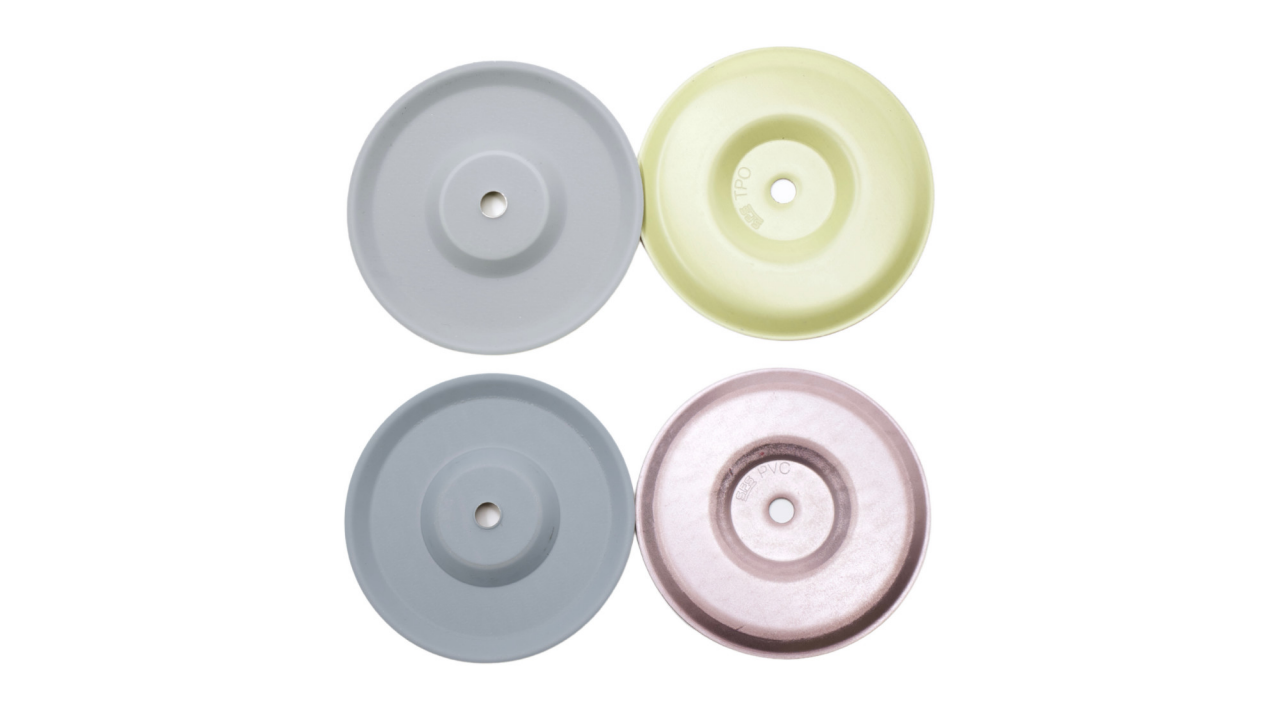 JM isoweld® is 3.12" (79.2 mm) round G-90 steel plate with a flat bonding surface of proprietary TPO or PVC adhesive coating. Utilizing induction weld technology, JM isoweld® simultaneously fastens the insulation and membrane. Designed to be used with JM #15 Dekfast Fasteners.
