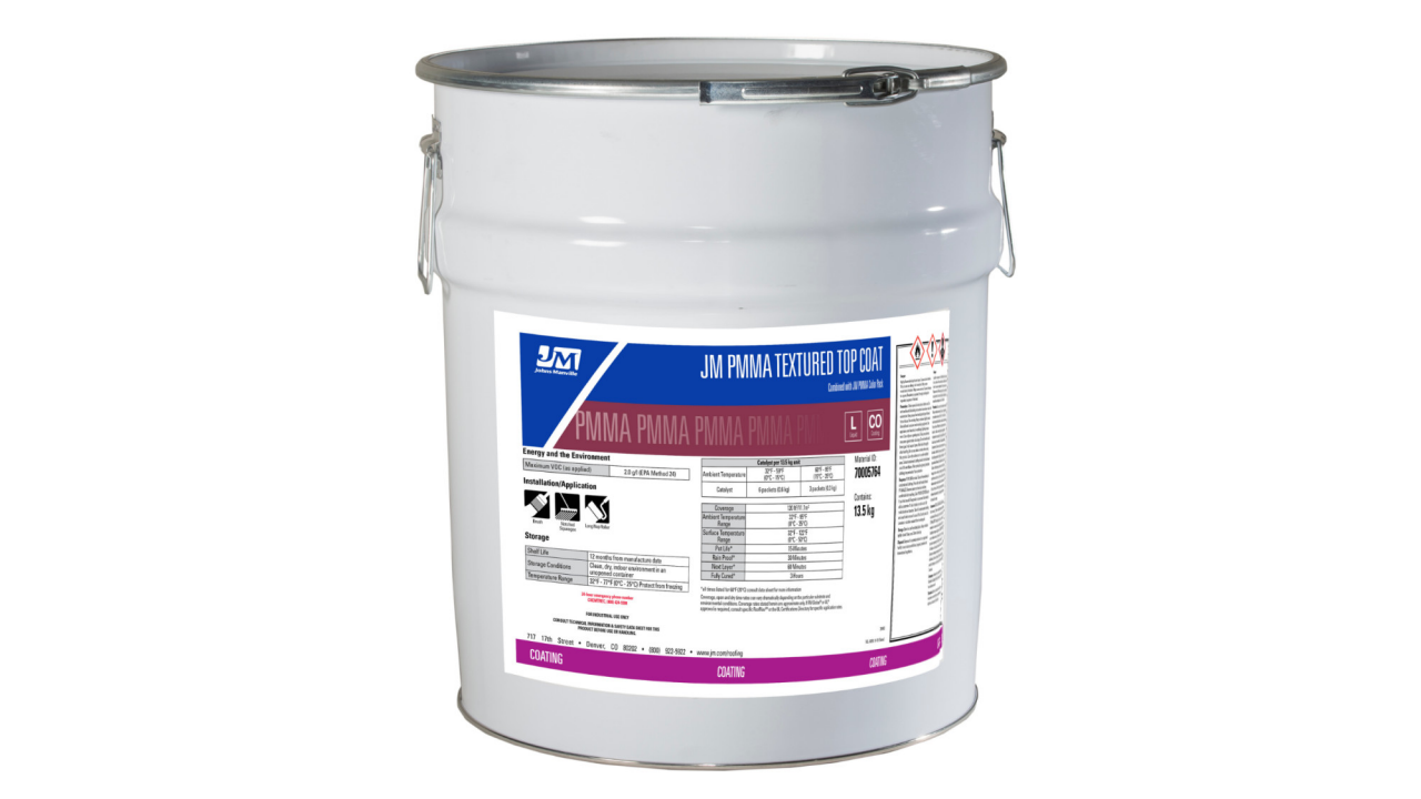 - Use JM PMMA Textured Top Coat with JM PMMA Color Pack and JM PMMA Catalyst to form a flexible resin with pre-mixed aggregate.